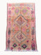 Its composition is 100% wool. The background color is pink and add touhces of peach color and orange wasted, due to the passage of time. Its figures are light brown, and dark brown. Another aspect to highlight of this beauty, is that it was finished in different month/years, because the weaving was probably finished as the family was collecting wool, after several months.