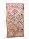 Its composition is 100% wool. The background color is pink and add touhces of peach color and orange wasted, due to the passage of time. Its figures are light brown, and dark brown. Another aspect to highlight of this beauty, is that it was finished in different month/years, because the weaving was probably finished as the family was collecting wool, after several months.